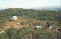 View from slope of eastern of the 3 Coega Kops northward to the northern kop, distance of about 150m William Massyn & Helen Vanderplank botanising. Groot Winterhoek Mts. In the misty far distance.