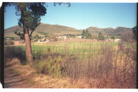 View from the west of Table Hill on 'Table Farm', 11km NW of Grahamstown and in the Noutoe River valley which runs into the New Year's River out of picture to the left The Noutoe River breaks through the bush-dotted hills on the horizon to the far right centre. This valley was used during the1700's as the main outspan to the east before entering the Great Fish River valley. The 'Grosvenor' rescue mission of 1783, with its 300 personnel and waggons etc, camped here for a fortnight. Dutch farmers settled here and were granted land in 1783.