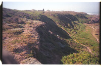 Cliffline facing the sea at Sacramento Trail, Schoenmakerskop, Port Elizabeth Overhang in dunerock in immediate foreground; not further east along the cliff-line towards and beyond Schoenmakerskop. Village trees in background.
