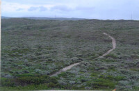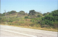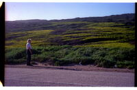 Chelsea Point, Marine Drive, Port Elizabeth Australian wattle kept low-cut by force of off-sea gales, a feature of this part of the rocky coastline. Belt of indigenous low-cut vegetation dark-green at edge of road beyond figure.