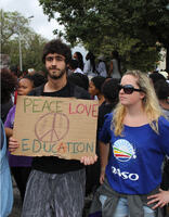 "Peace love education" On Wednesday, 21 October 2015, Rhodes University closed in solidarity with the higher education sector as students and staff embarked on nationwide protest action against the shortage of funding in the South African higher education sector. #FeesMustFall is a national student led protest movement that began in mid-October 2015 in response to proposed increases in fees at South African universities. These images depict the peaceful march and illustrate the extent of solidarity among staff, students and community members who joined in support of the protest.