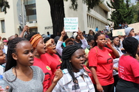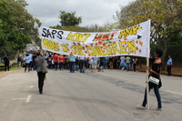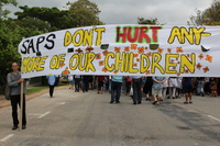 "SAPS don't hurt any more of our children" On Wednesday, 21 October 2015, Rhodes University closed in solidarity with the higher education sector as students and staff embarked on nationwide protest action against the shortage of funding in the South African higher education sector. #FeesMustFall is a national student led protest movement that began in mid-October 2015 in response to proposed increases in fees at South African universities. These images depict the peaceful march and illustrate the extent of solidarity among staff, students and community members who joined in support of the protest.