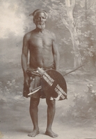 Prince Kekolokowina in full dress Full-length portrait of a young man dressed in a leopard skin kaross, carrying a small ornamented ox-hide shield, assegais and a kierie. The portrait is annotated in pencil, "Prince Kekolokowina in full dress".