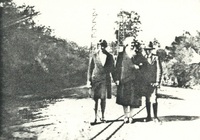 Suspension Bridge, Vida, Frances and Rodney Frances, Vida and Rodney Workman photographed on suspension bridge. -