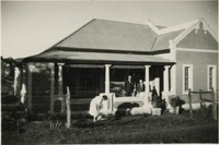Stringfellow St Cottage, 1948 Photograph of the Stringfellow Street Cottage (presumably beloning to the Workman family). Two men can be seen standing on the porch, while a woman waters the garden. -