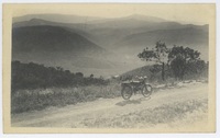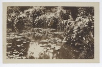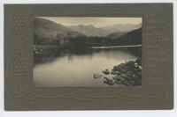 Photo (mounted on green card with printed Wordsworth verse) of river and mountain scene -