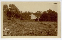 Photo of a farm house with pumpkins on a wagon in foreground -
