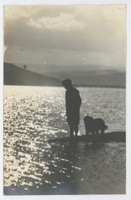 Photo (mounted on pale green card) of boy with dog at water's edge, with row boat in background -