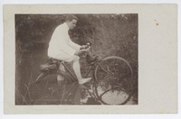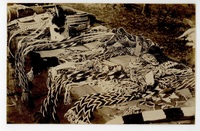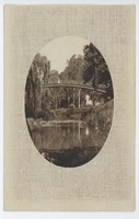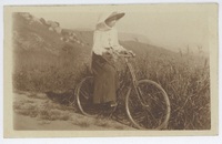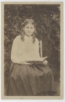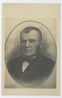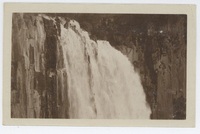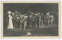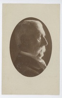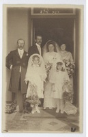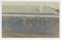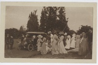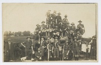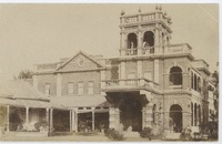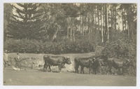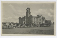 Photo of an ox wagon with team in front of a large building with clock tower -