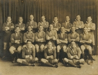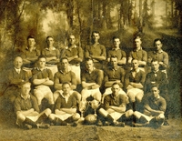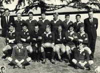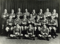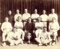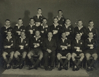 Albany Rugby Football Club 2nd XI Albany Rugby Football Club 2nd XI, Winners of Grahamstown 2nd Division, trophy cup in front, Team photograph with rugby/football players, in white formal suits, Group photograph, Black and white photograph, Indoor photograph, Secretary wearing a suit, Most players have arms crossed, some have their arms on their legs, while one player has his hands behind his back, Curtain acts as a background, Back Row: A. R. Scholl, C. Jones, J. Barry, B. McTavish, S. Pike, F. Collier, Sitting: G. Channer, B. Harvey (Captain), G. E. Greathead, J. Cooney (Vice-Captain), H. Walker, Front Row: J. Dickason, N. Harvey.