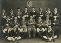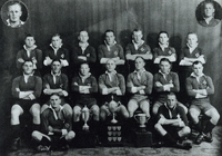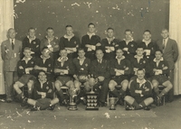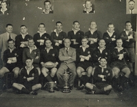 Albany Rugby Football Club 1st XV, 1929 Albany Rugby Football Club 1st XV 1929. 1st XV - Season 1929, Winners of the Michau Cup and Birch Cup, trophy cup in front, Runners up Eastern Province Cup, Team photograph with rugby/football players, in rugby uniform, Rugby ball lying between two trophy cups, Players have arms crossed, Group photograph, Black and white photograph, Indoor photograph, Back Row: S. Bester, P. B. Norton, M. Ramsden, M. Ansley, F. Guest, G. B. Pohl, J. Dickason, Sitting: H. C. Loary, G. C. Mullins, J. Dold, H. Barber, G. Mullins, Insets: Eagleton, C. Mandy, C. F. Hydenrecht, J. P. Fahrenheim.