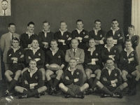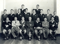 Albany Rugby Football Club 1st XV, 1946 Albany Rugby Football Club 1st XV 1946. Team photograph with rugby/football players, in rugby uniform, Players have arms crossed, Group photograph, Black and white photograph, Indoor photograph, Winners of the Michau Cup and Pauletta Cup, trophy cup in front, J Norton, Colin Keey, President and Secretary wearing suits, Captain holding rugby ball with “Albany 1946” on it, Back Row: J. van der Walt, A. Meaker, M. Parry, Standing: J. du Plessis, M. Pike, J. Strauss, L. Smit, R. Howard, A. Lilford, H. Bowker, T. Hounsell, C. Penny, Sitting: J. Norton, W. Swart, Colin Keey, T. Mills (Captain), T. van Vuuren (President), B. Mills, Paddy Dale (Secretary), In Front: R. Reed, D. Seaman.