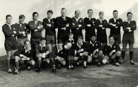 Albany Rugby Football Club 1st XV, 1963 Albany Rugby Football Club 1st XV 1963. Team photograph with rugby/football players, in rugby uniform, Group photograph, Indoor photograph, Black and white photograph, President, secretary and coach wearing suits, Players have arms crossed, Captain holding rugby ball with “1963” on it, Back row (left to right): N. Borman, C. Saaiman, C. Howie, J van Rensburg, D. H. Brown, N. Webb, J Grocott, D. Dundas, A. Paauw, Seated (left to right): W Fourie, R. Nieuwenhuizen (Secretary), P. du Preez (captain), Dr. C. J. Dreyer (President), G. Borman (Vice-Captain), F. Zietsman (coach), E. Rothman, Front (left to right): E. Kent, L. Mallett.