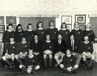 Albany Rugby Football Club 1st XV, 1974 Albany Rugby Football Club 1st XV 1974, Team photograph with rugby/football players, in rugby uniform, Group photograph, Black and white photograph, Indoor photograph, Framed photographs against wall in background, President, Club Captain and Coach wearing suits, Captain holding rugby ball with “1974” on it, Players standing have arms by side, Players sitting have hands in lap, Standing (left to right): A Marais, R. Snow, R. Green, B. Shone, P. van Rensburg, S. Long, D. J. Mills, S. Hill, Sitting: (left to right): L. Webster, R. Carlson, J. Place (President), B. Carlson (Captain), P. Long (Club-Captain), Major Bakkes (Coach), R. Moss, Front (left to right): A. Austin, C. Reed. Absent: C. Pascoe.