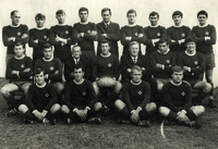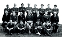 Albany Rugby Football Club 1st XV, 1970 Albany Rugby Football Club 1st XV 1970,1st XV 1970, Team photograph with rugby/football players, in rugby uniform, Group photograph, Black and white photograph, Outdoor photograph, Players standing and sitting have arms crossed, Players sitting on the grass have arms in lap, President and coach and Treasurer wearing suits, Photograph against wall, which is the background, Sitting on grass, Captain holding rugby ball with “1970” on it, Back Row (left to right): R. Pittaway, L. Rose-Innes, D. Niewoudt, G. Reed, J. Place (Treasurer), Middle Row (left to right): B. Green, W. Fourie, H. Blomfield (President), E. Olivier (Captain), P. du Preez (Coach), C. Warren, D. Pohl, Sitting (left to right): C. Reed, D. Klaasen, B. Connock, C. Clymer, Absent: J. Nepgen, C. Pascoe.