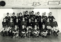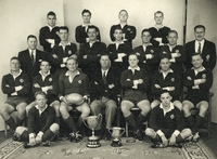 Albany Rugby Football Club 1st XV, 1956 Albany Rugby Football Club 1st XV 1956. Winners of the Birch Cup and Michau Cup, trophy cup in front, Team photograph with rugby/football players, in rugby uniform, Players have arms crossed, Group photograph, Black and white photograph, Indoor photograph, Honourary Secretary and President wearing suits, Captain holding rugby ball with “1956” on it, Standing (left to right): R. Rawlinks (Honourary Secretary), C. Smit, T. Keey, O. Robey, C. Edelson, L. Naested, R. Nieuwenhuizen, N.Webb, Sitting (left to right): C. Lombard, B. Mills, T. Mills (Captain), Mr. L. B. Green (President), J. Place (Vice-Captain), H. le Roux, L. Emms, Front Row (left to right), P. le Roux, R. Wise, Insets: R. Johnson, A. Leach, J. Linde, P. Dale (Club Captain).