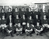 Albany Rugby Football Club 1st XV, 1964 Albany Rugby Football Club 1st XV 1964. Team photograph with rugby/football players, in rugby uniform, Group photograph, Indoor photograph,Black and white photograph.Secretary and President wearing suits, Player standing have arms crossed, Players sitting have hands in lap, Back row (left to right): L. Mallett, D. Blomfield, C. Brown, D. Albertyn, N. Webb, M. Loots, Sitting (left to right): E. Kent, R. R. Nieuwenhuizen (Secretary), P. du Preez (captain), Dr. C. J. A. Dreyer (President), C. Howie (vice-captain), W. Fourie, J van Rensburg, Front sitting (left to right): D Pitt, N. Dugmore, D. Handley, N. Steffens, Absent: J. Strydom, T. C. Mills (Coach).
