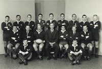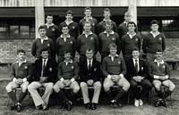 Albany Rugby Football Club 1st XV, 1988 Albany Rugby Football Club 1st XV 1988, Winners of the “Frans Geldenhuys Cup”, “Goodyear 7 a side” and “UCT Cup”, Team photograph with rugby/football players, in rugby uniform, Group photograph, Black and white photograph, Outdoor photograph, Vice President, President and Manager wearing suits, Players standing have arms behind their backs, Players sitting have arms in their laps, Back Row (left to right): M. Calitz, J. de Beer, J Waugh, L. Claasen, J. Spies, Middle Row (left to right): J. Vos, J. du Toit, N. Swart, D. Ferriara, P. Henderson, G. Maas, Front Row (left to right): B. Beneke, J. Moolman (Vice President), D. Meyer (Captain), R. Liddiard (President), W. Currie (Vice Captain), L. Wolmarans (Manager), J. Jacobs, Absent: B. Peterson (Coach), M. Koen.