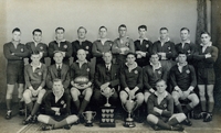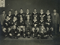 Albany Rugby Football Club 3rd XV, 1956 Albany Rugby Football Club 3rd XV 1956, Winners of the Midlands Cup, Grahamstown Cup and Abbot Cup, trophy cups in front,Team photograph with rugby/football players, in rugby uniform, Group photograph, Black and white photograph, Indoor photograph, Players have arms crossed, Captain holding rugby ball with “1956” on it, Honourary Secretary, Coach and President wearing suits, Standing (left to right): R. Rawlinks (Honourary Secretar), L. Kritzinger, N. Louw, D. Law, H. Schooling, K. Watson, I. Futter, D. Wright, Sergeant Heath (Coach), Sitting (left to right): N. Green, S. van der Watt, D. Nieuwenhuizen (Captain), Mr. L. B. Green (President), J. Coetzer, C. Erasmus, D. Wallace, Front row (left to right): R. Liddiard, W. Steffens, Inset: P. Dale (Club Captain)