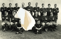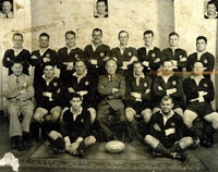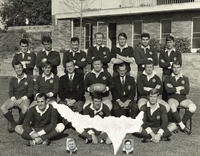 Albany Rugby Football Club First XV, 1959 Albany Rugby Football Club 1st XV 1959. First XV – 1959 Season, Team photograph with rugby/football players, in rugby uniform, Players have arms crossed, Group photograph, Black and white photograph, Indoor photograph, Secretary and President wearing suits, Rugby ball lying between players sitting in front, on the floor, Back row: R. Nieuwenhuizen, N. Webb, I. Anderson, A. Leach, A White, N. Murgatroyd, F. Heath, K. Starck, Sitting: R. Rawlinks (Secretary), R. Wise, T.C. Mills (Captain), L. B. Green (President), T. W. Mills (Vice-Captain), L. Emms, H. Le Roux, In Front: N. Borman, J. Breytenbach, Insets: P. Dale, T. Keey, J. van Rensburg.