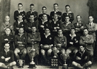 Caledonian Association Football Club 1st League, 1926 Caledonian Association Football Club 1st League 1926. 1st League 1926, Winners of the Webb Cup, Dewar Shield, Eastern Province Challenge Cup, trophy cups and shield in front, Team photograph with rugby/football players, in rugby uniform, Group photograph, Black and white photograph, Indoor photograph, Players have arms crossed, Vice Presidents, President and Linesman wearing suits, Ball with “CAFC 1926” on it lying in front of shield, Back Row: H. Howell, T. Cooney, H. Hutchison, T. Evans, G. McDougall, W. Emmerson, L. Hope, Middle row: Mr. J. P. McDermott (Vice-President), G. Pinnock, Mr. E.H. Reed (Vice-President), H. Tibbs (Captain), Mr. A. Blair (President), G. Montleo (Vice-Captain), D. Hope (Linesman), Front Row: F. Diggeden, B. Hope.