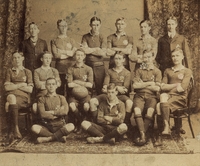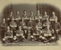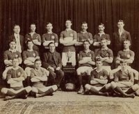 Albany Rugby Football Club, 1895 Albany Rugby Football Club 1895. Winners of the Eastern Province Cup, trophy cup at the back on a pedestal, Team photograph with rugby/football players, in rugby uniform, Black and white group photograph, Players at back and sitting right in front have arms crossed, President wearing suit, Captain holding rugby ball in his lap, Back Row (left to right): S. Duffield, J. Dicks, G. Morris, J. B. Walker, W. C. Lawrance, W. C. Muirhead (President), Second Row (left to right): A. Stone, E. C. Goldswain, F. H. Guthrie (Captain), G. Crozier, Front Row (left to right): H. E. Austen, P. D. Hunter, D. Dold, D. Dicks, E. Stanton.