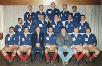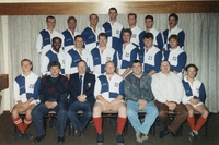 Albany Rugby Voetbal Klub Tweede Span, 1998 Albany Rugby Voetbal Klub Tweede Span 1998, Tweede span - 1998, Team photograph with rugby/football players, in rugby uniform (blue jersey, white shorts, red socks), Group photograph, Colour photograph, Indoor photograph, Players standing have arms in front of themselves, by their sides or behind their back while those sitting have their hands in their laps, Agter (van links na regs): D. Potgieter, G. Dyson, G. Petser, M. Sweeny, D. Crous, Middel (van links na regs): A. Estruis, S. Thompson, J. Botha, H. Warrington, N. van Vuuren, J. Lourens, Voor (van links na regs): F. Zeelie, P. Demmers, G. Sawyer (President), N. van Vuuren (Kaptein), Joos Vos (Afrigter), I Dorfling, T. Pretorius.