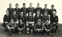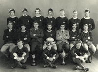Albany Rugby Football Club 3rd XV, 1971 Albany Rugby Football Club 3rd XV 1971, Winners of United Trophy Midlands League and Santam Cup North East Cape, trophy cups in front, Team photograph with rugby/football players, in rugby uniform, Group photograph, Black and white photograph, Outdoor photograph, Treasurer, President, Coach and Club Captain wearing suits, Players standing at the back have arms by their sides, Players sitting have hands in their laps, Captain holding rugby ball with “1971” on it, Back Row (left to right): W. van Eck, J. Cherry, H. de Friendt, P. van Rensburg, R. Burger, D. Wicks, F. Oosthuizen, Middle Row (left to right): J. Place (Treasurer), J. O’Kennedy, H. M. Blomfield (President), J. Ellmore (Captain), P. Du Preez (Coach), A. G. Wakeford, L. Pohl (Club President), Front Row (left to right): A. Pittaway, J. H. Meyer, M. Mather Pike, D. Klaasen, Absent: G. Coetzee.