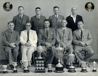 Albany Rugby Football Club Trophies Won, 1947 Albany Rugby Football Club Trophies Won 1947, Group photograph of the Executive Committee, all wearing suits, Black and white photograph, Indoor photograph, Men standing have arms by their sides, Men sitting have arms in their laps, Row of trophy cups displayed in front of the Executive Committee, Standing: L. B. Green (Secretary), T. C. Mills (Captain), W. Steyn (Vice Captain), J. B. Norton (Treasurer), Sitting: H. L. Connock (Selector), C. Fortune, M. J. Ansley (President), S. J. Hunter, C. J. Dale (Selector), Insets: A. C. Keey (Club Captain), T. van Vuuren (Late President).