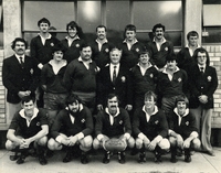 Albany Rugby Football Club 2nd XV, 1982 Albany Rugby Football Club 2nd XV 1982,Team photograph with rugby/football players, in rugby uniform, Group photograph,Black and white photograph, Outdoor photograph with brick wall with windows as background, Back and middle row standing, arms by the side or hands held together, Front row on hunches, hands held together, Captain holding rugby ball with “Super Springbok” on it, Coach, President and Manager wearing formal attire, Back Row: P. Rossouw, S.Fitzhenry, G. Green, J. Smit, J. de Beer, L. Bowles, Middle Row: G. Reid (Coach), F. Coetzer, D. Moriarty, Dr. H. V. Gibson (President), P. Heyns, W. Legg, G. Sawyer (Manager), Front Row: A. Breedt, C. Cherry, B. Waters (Captain), R. Everill, M. Pote.