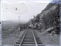 View showing men working to clear a rockslide over a railway line -