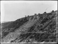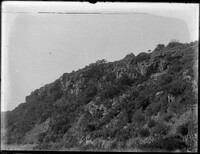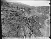 View showing a crowd of men, both white and African, looking at the results of a rockfall, or possibly a landslide -