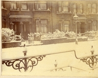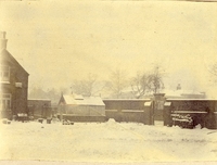 Photograph of a winter scene showing a snow covered yard Photograph of a winter scene showing a snow covered yard with several houses in the background. -