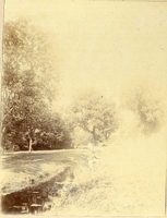 Photograph of a pastoral scene showing a country road Photograph of a pastoral scene showing a country road with overhanging trees. -