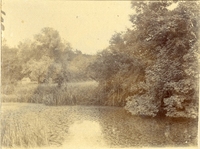 Photograph of a small river with several trees on the bank Photograph of a small river with several trees on the bank. There is a small cottage in the distance. -