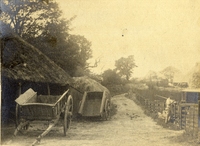 Photograph of a farm scene showing farmer standing at a wooden fence Photograph of a farmer standing at a wooden fence holding a hay fork. There are two wagons in the foreground. -
