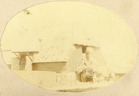 Photograph of a hayloft Photograph of a hayloft with hay being shovelled onto a wagon below. -