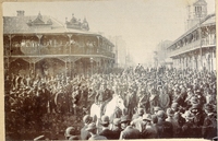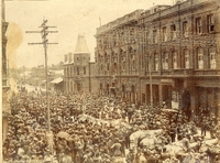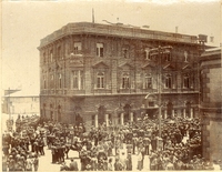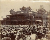 Photograph entitled "Waiting for the worst news" Photograph entitled "Waiting for the worst news" showing a large group of people in front of the offices of Charles Leonard, Attorney at Law (leader of the Johannesburg Uitlanders in December 1895).