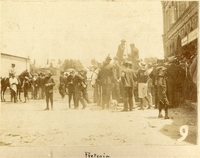 Photograph entitled "Pretoria" Photograph entitled "Pretoria" showing a group of men, some armed and some on horseback, on a Pretoria street.