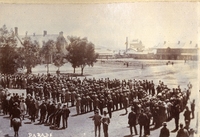 Photograph entitled "Parade" Photograph entitled "Parade" showing a large group of men, many armed with rifles, lined up to march on a large field beside some buildings.