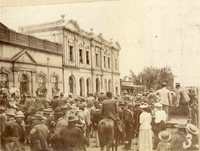 Photograph entitled "Rand Club, Johannesburg: Sir Jacobus de Wet addressing the crowd" Photograph entitled "Rand Club, Johannesburg: Sir Jacobus de Wet addressing the crowd" showing a large group of people in front of, and on the balcony of, the Rand Club in Johannesburg