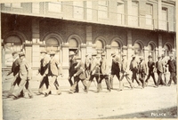 Photograph entitled "Police" Photograph entitled "Police" showing a group of policemen marching down a street. They are in plain clothes and are wearing white bands printed with the word "Police" around their left arms.
