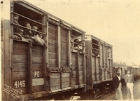 Photograph entitled "Women and children flee in cattle trucks" Photograph entitled "Women and children flee in cattle trucks" showing a number of women and children on a train ; there are three men in the foreground.