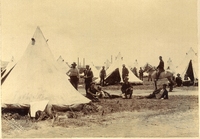 Photograph entitled "Village Main Reef Camp" Photograph entitled "Village Main Reef Camp" showing a group of men in a mining camp containing tents.