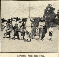 Newspaper clipping titled: "Refugees from Fordsburg" Newspaper clipping titled: "Refugees from Fordsburg". The photograph shows a group of men, women and children carrying their possessions.