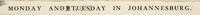 Newspaper clipping of an article heading which reads: "Monday and Tuesday in Johannesburg." Newspaper clipping of an article heading which reads: "Monday and Tuesday in Johannesburg.".