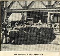 Newspaper clipping titled: "Commissioner Street barricade" Newspaper clipping titled: "Commissioner Street barricade" showing armed men behind a sandbag fortification.