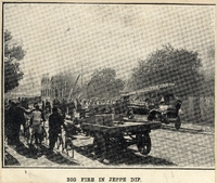 Newspaper clipping titled: Big fire in Jeppe Dip Newspaper clipping titled "Big fire in Jeppe Dip". The photograph shows a fire engine and several people in front of a burning building.