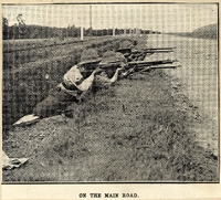 Newspaper clipping titled: "On the Main Road" Newspaper clipping titled: "On the Main Road" showing armed men lying in a trench beside a road.