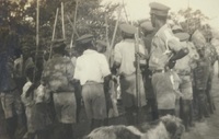 A group of boys (Pathfinders) performing folk dance A photograph album compiled by Mary Butler, containing photographs of Wayfarers, Sunbeams and Pathfinders, mostly in Cradock. Two newspaper clippings and a handwritten concert programme included. There are three photographs of Rev. James Arthur Calata's young daughters, and he himself is included in two photographs. This photograph shows a group of young and older boys, Pathfinders, wearing uniform and performing a folk dance